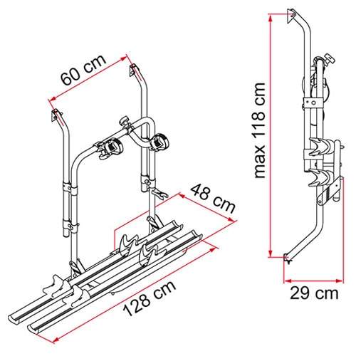 Ce porte-vélos est conçu pour s'adapter aux fourgons avec une largeur d'entraxe comprise entre 58 et 62 cm.