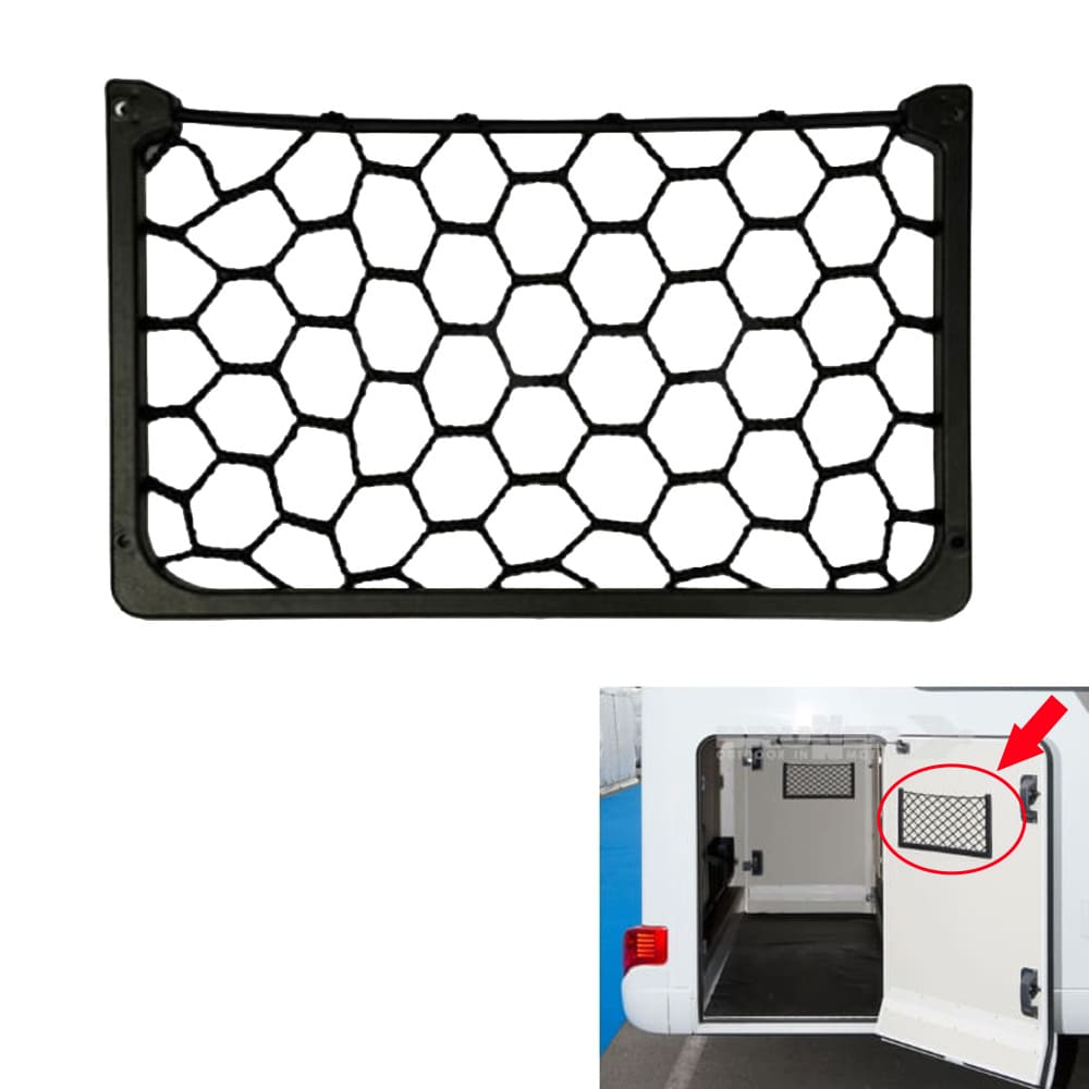 Filet porte-objets avec bords en métal et couverture en matière plastique pour camping-car, fourgon ou van.