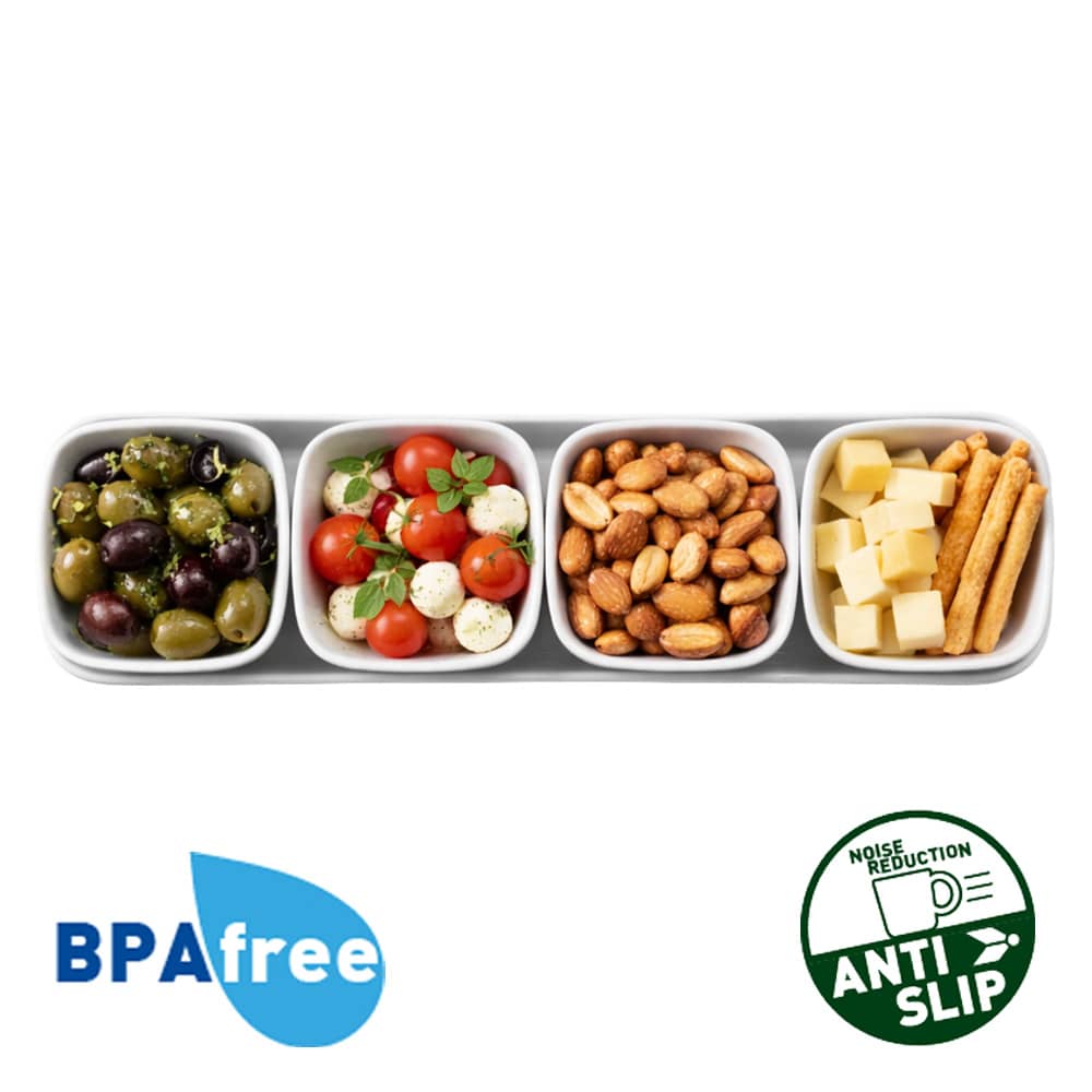 Composé d'un plateau et de 4 coupelles pratiques, ce set permet de présenter facilement des snacks salés, bonbons, sauces, condiments ou épices lors d'un apéritif, d'un pique-nique ou d'un repas en extérieur.
