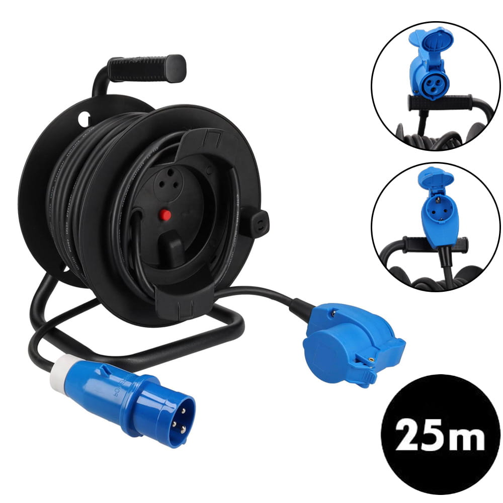 Enrouleur automatique 25m câble électrique avec fiche et prise coudé CEE
